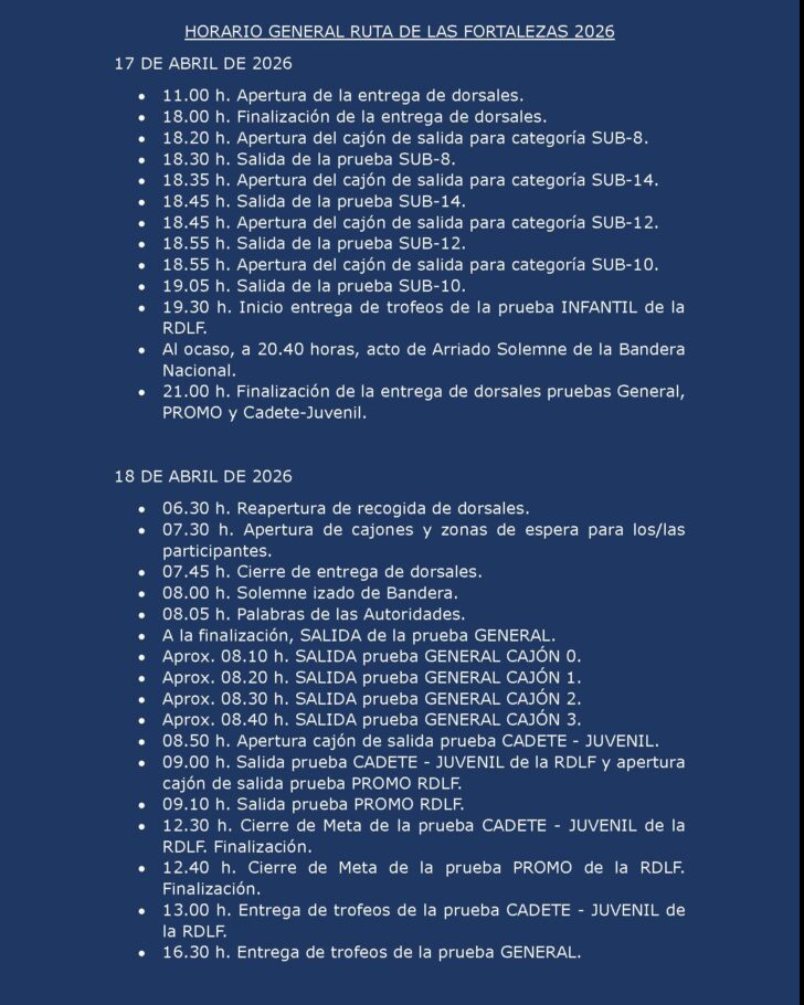 - 07:00-18:30 h. (Consultar horarios del día en imagen adjunta a esta convocatoria o en https://rutadelasfortalezas.es/ )