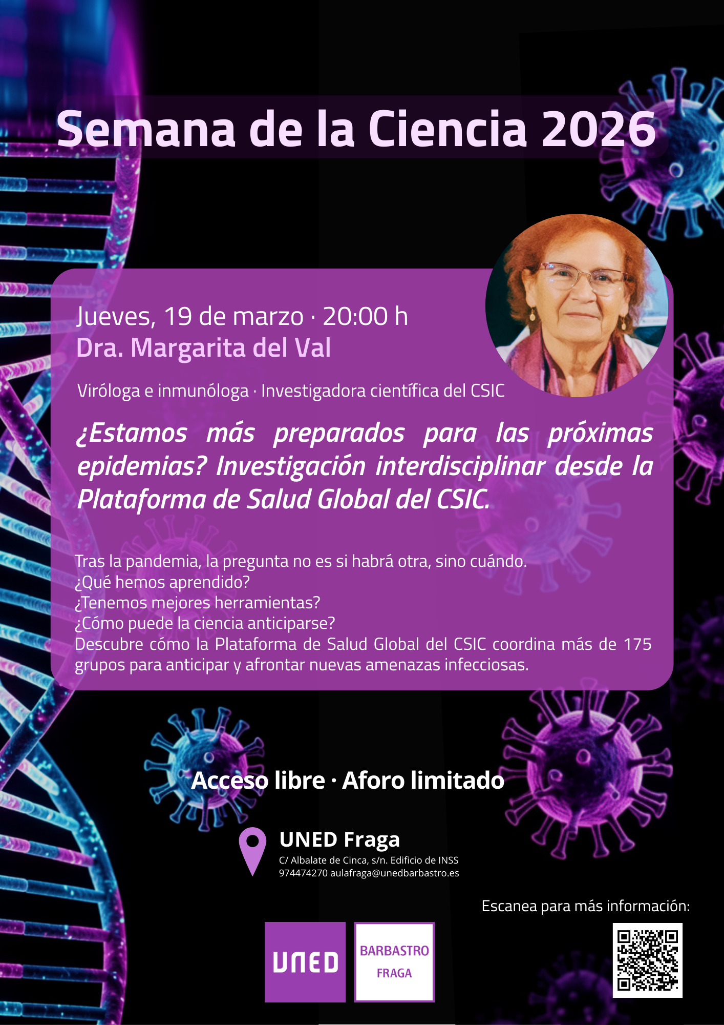 Hemos enfrentado con éxito una pandemia. ¿Qué sabemos y hemos aprendido ante próximos retos semejantes? La globalización aumenta nuestra vulnerabilidad a las infecciones. Hay riesgo de pandemias futuras, y todas serán diferentes, pero ahora tenemos más conocimiento y herramientas para enfrentarlas con confianza y energía, como investigadores, como sociedad y como ciudadanos. La Plataforma de investigación interdisciplinar en Salud Global del CSIC es una iniciativa dinámica, cohesionante, sinérgica, colaboradora y orientada hacia empresas y diversos sectores de la sociedad. Sus 175 grupos de investigación enfrentan retos infecciosos con potencial pandémico.